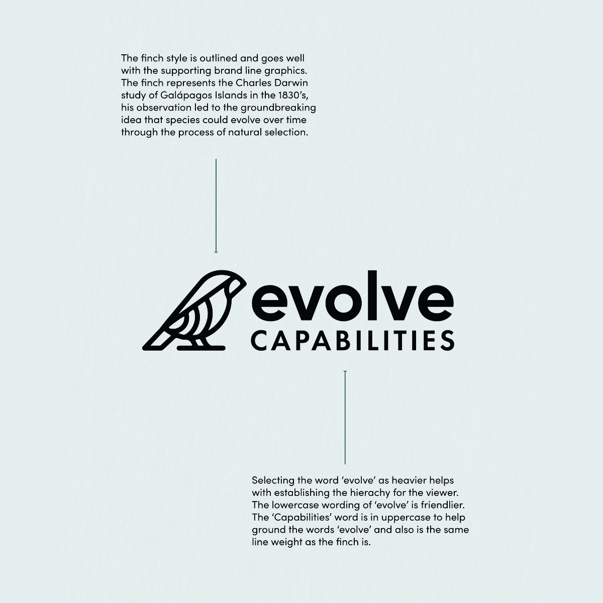 Our focus was on representing and crafting Evolve Capabilities' visual identity. This began with offering concepts, covering elements like logos, colour schemes, typography, and supporting brand graphics, including visual brand mock ups on how the brand could look applied on LinkedIn, website, and collateral. The selected final concept for the visual brand identity was the finch logo, where the lines symbolise system integration and human connections. These lines are organic to reflect the unique, quirky personalities at Evolve Capabilities, highlighting their distinctive way of questioning and thinking outside the box.